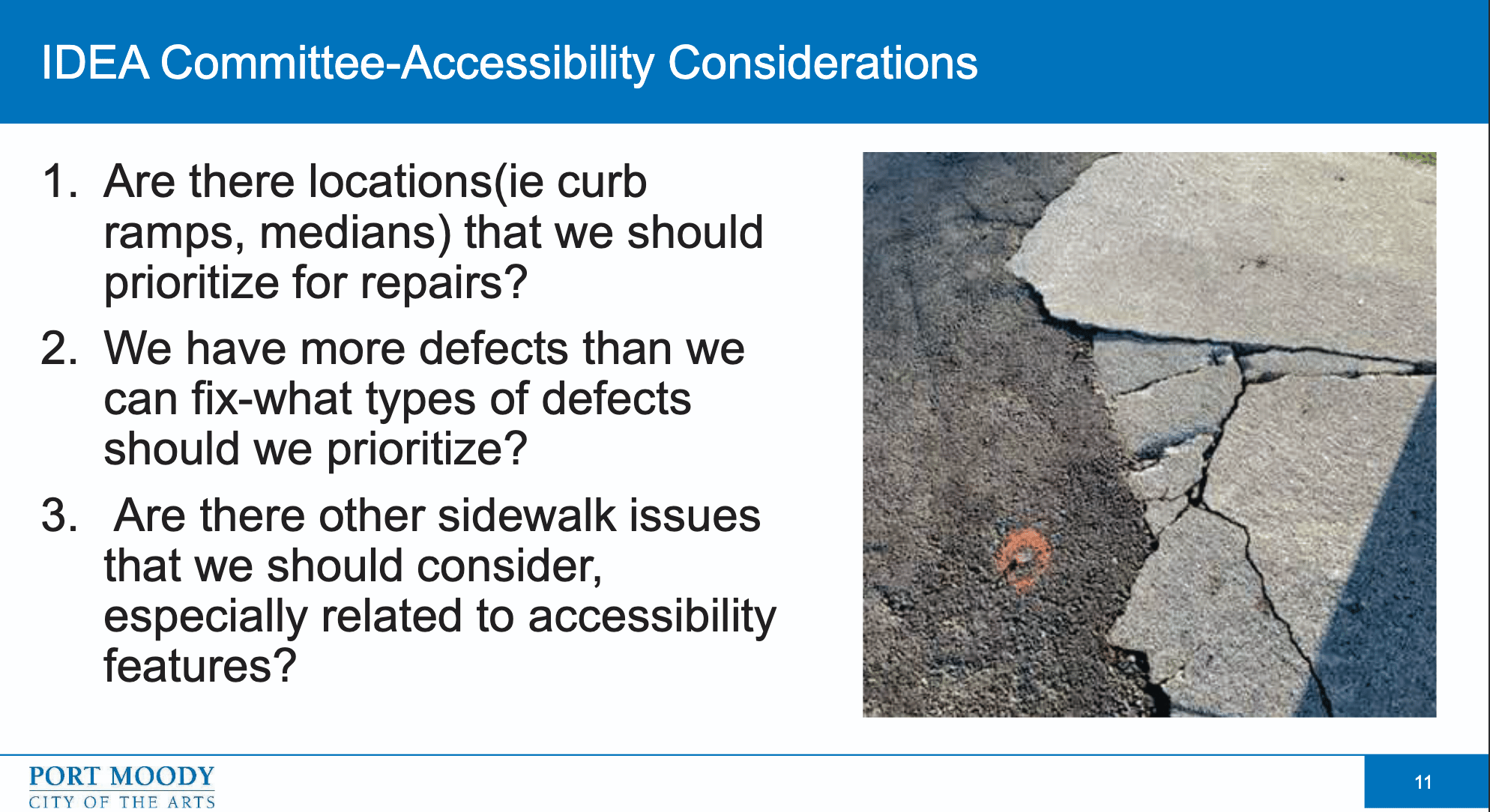 I’m fortunate to be the chair of the IDEA committee this year. Our first meeting in January was largely housekeeping – reviewing the workplan, going over how the committee system works, etc. February’s meeting was more substantial with two presentations: Sidewalk and Walkway Inspection Policy and Accessibility Plan.